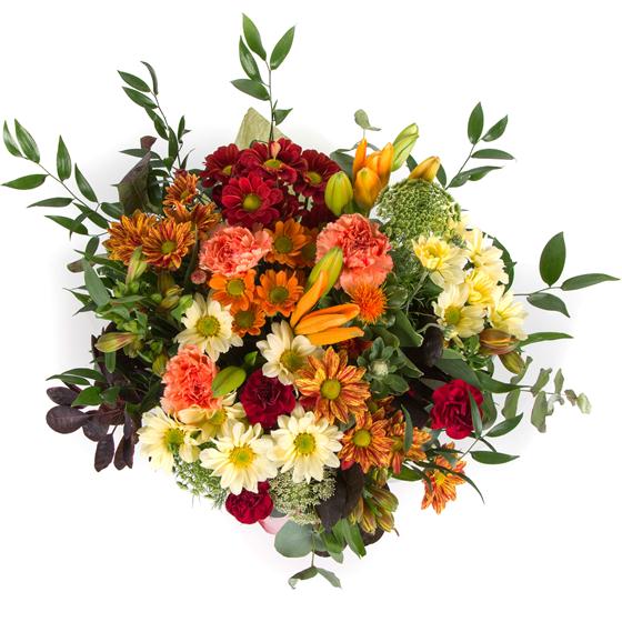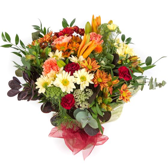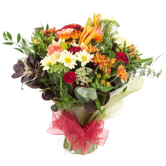 A beautiful versatile bouquet in autumnal shades is a real blaze of colour, with vivid oranges, rich reds and golden yellows.