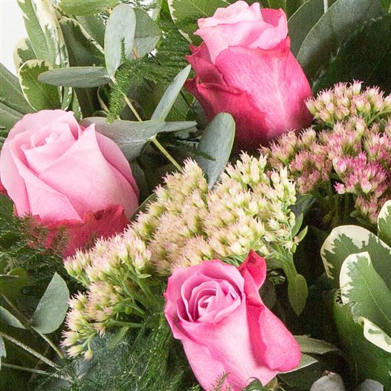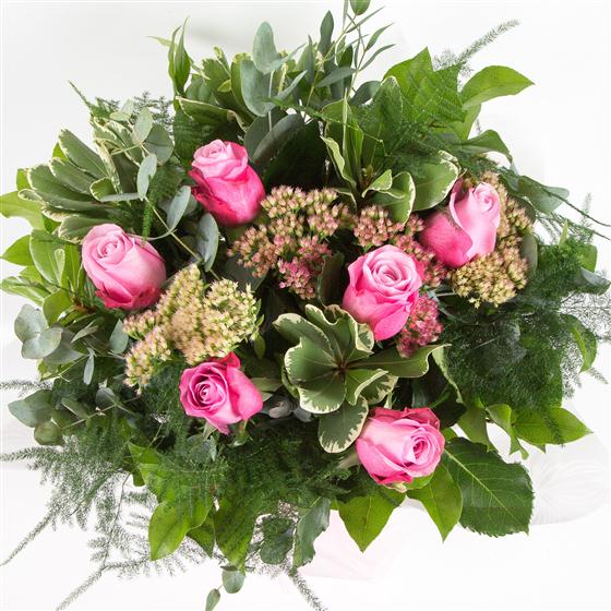 A hand-tied bouquet of six quality pink roses encased in a selection of greenery.